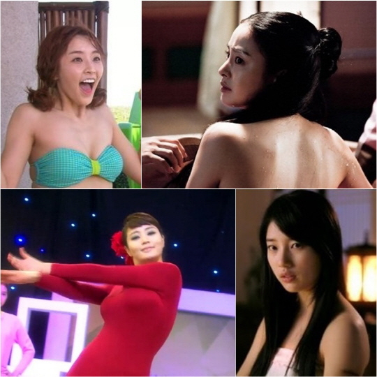 이에 질세라 수지도 가세했다. 지난 22일 방송한 MBC 월화극 '구가의 서'에서 수지는 팔에 상처를 입고 직접 상처를 치료하기 위해 어깨를 고스란히 노출했다. 극중 남자 못지않은 무사로 담여울 캐릭터를 맡고 있는 수지이기 때문에 호응도 더 컸다. 하지만 강도는 정유미와 김혜수가 더 셌다. 정유미는 SBS 주말극 '원더풀 마마' 22일 방송분에서 비키니를 입은 모습이 공개돼 화제가 됐다. 또 김혜수는 KBS2 월화극 '직장의 신'에서 빨간 내복을 입고 몸매를 그대로 드러낸 채 코믹 댄스를 선보여 눈길을 끌었다.