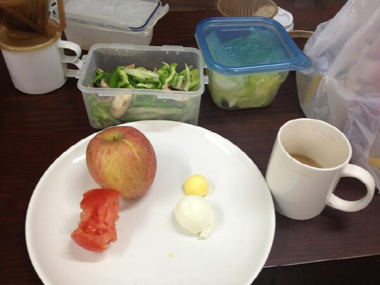 사진 속에는 샐러드가 담긴 통 두 개와 사과, 토마토, 삶은 계란 흰자와 노른자가 각각 한 개씩 보인다.