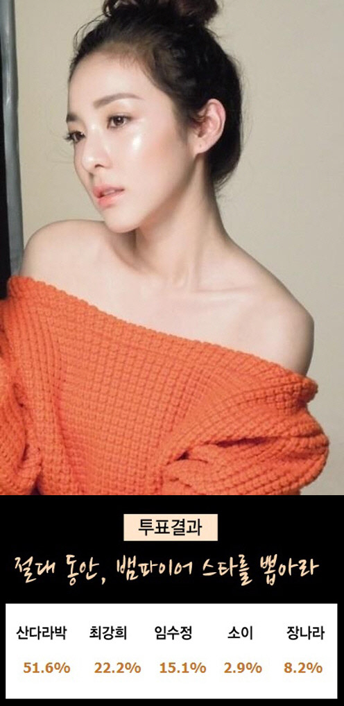 그 결과, 산다라박은 최강희, 임수정 등 수많은 여자 스타들을 제치고 당당히 1위에 오르며, '뱀파이어'의혹을 사는 절대 동안 스타로 이름을 올렸다.