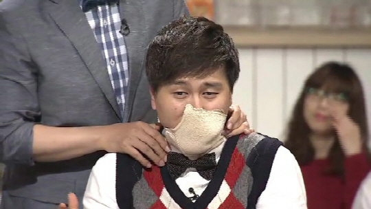 개그맨 변기수가 여성의 브래지어로 코와 입을 가리는 다소 민망한 모습으로 웃음을 선사했다.