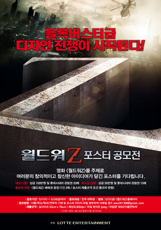 오는 6월 개봉 예정인 '월드워Z'를 주제로 창의적이고 참신한 아이디어가 담긴 포스터를 찾는 이번 '월드워Z 포스터 공모전'은 5월 1일부터 5월 24일까지 대한민국 대학생이라면 누구나 응모할 수 있다. 응모자들은 출품규격에 맞춘 포스터 파일 및 이름, 학과, 연락처 등 간단한 신상명세를 이메일(wwz201306@gmail.com)로 접수하면 된다. 최종 수상자는 5월 31일 '월드워Z' 홈페이지를 통해 발표할 예정이다. 대상 수상자 1명에게는 상금 100만원과 롯데시네마 예매권 20매, 우수상 수상자 2명에게는 상금 50만원과 롯데시네마 예매권 10매를 수여하며 응모자 전원에게는 '월드워Z' 예매권을 증정한다. 수상자에게는 깜짝 놀랄만한 특별 부상이 마련되어 있으며 이는 수상자 발표 후 고지할 예정이다. 자세한 사항은 <월드워Z> 공식 홈페이지(www.worldwarz.co.kr)를 통해서 확인할 수 있다.