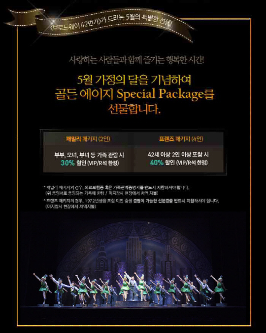 뮤지컬 '브로드웨이 42번가'(CJ E&M, 설앤컴퍼니 제작)가 가정의 달 5월을 맞아 '골든 에이지 스페셜 패키지'를 선보인다.