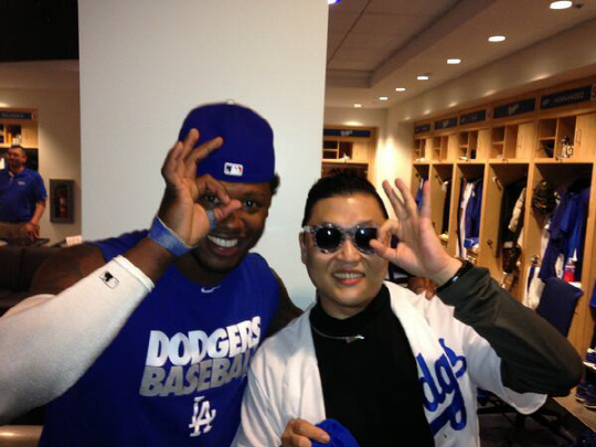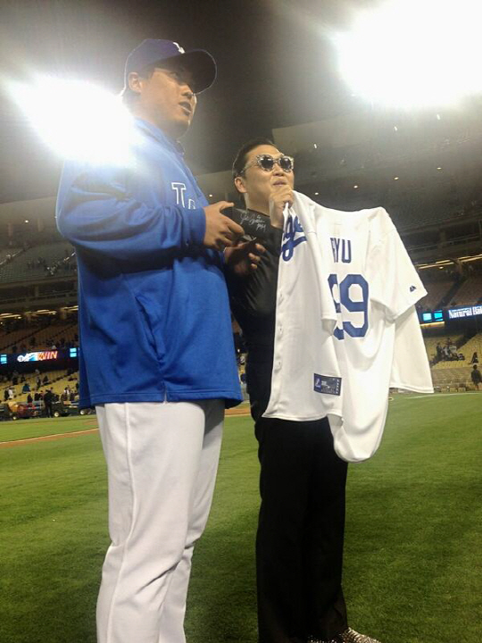 싸이의 응원은 여기서 그치지 않았다. 경기가 끝난 뒤엔 라커룸을 찾아 류현진의 팀 동료들을 만났다. 핸리 라미레즈, 맷 캠프 등 다저스의 간판 선수들이 싸이와 함께 사진을 찍으면서 즐거워했다. 빌보드 차트 1위에 도전하고 있는 싸이는 다저스 선수들 사이에서도 인기 만점이었다. 핸리 라미레즈는 자신의 트위터에 "오늘 경기가 끝나고 싸이를 만났다"며 싸이와 함께 찍은 사진을 공개하기도 했다.