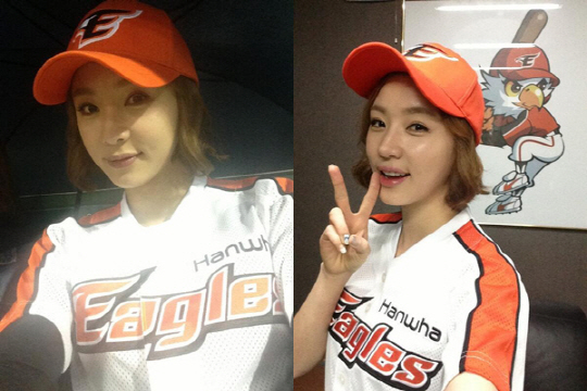 탤런트 사희가 한화 유니폼을 입고 찍은 시구 인증샷을 공개했다.