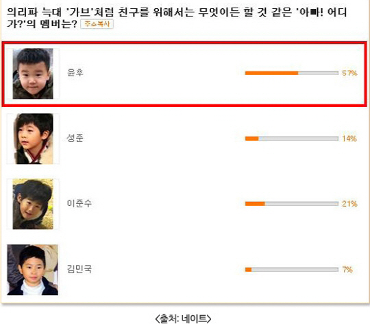 포털사이트 네이트는 4월 29일부터 "의리파 특대 가브처럼 친구를 위해 뭐든 할 것 같은 MBC '아빠! 어디가?' 멤버는?"이란 주제의 설문조사를 진행했다. 조사 결과 윤후는 57%의 압도적인 지지율로 1위를 차지했다. 네티즌들은 '후가 대세! 형들 챙기는 모습이 딱 의리파' '지아(송종국 딸)에게도 다정한 윤후가 친구를 위해서도 뭐든 할 것 같다'는 등 다양한 반응을 보였다. 이어 이종혁 아들 이준수가 2위(21%), 성동일 아들 성준이 3위(14%), 김성주 아들 김민국이 4위(7%)를 차지했다.