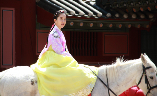 6일 공개된 촬영 현장 사진에서 아영은 곱게 한복을 차려입고 하얀 백마에 올라 다소곳하게 앉아 카메라를 응시하며 우아한 공주의 자태를 과시했다.