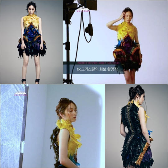 온스타일 '프로젝트 런웨이 코리아 올스타(이하 프런코 올스타)' 9화의 게스트 심사위원으로 나선 f(x) 크리스탈이 우승자 이명신 디자이너의 깃털 드레스를 입고 화보촬영에 나섰다. 크리스탈은 형형색색의 깃털 드레스를 입고 카메라 앞에서 신비로운 매력을 발산했다.