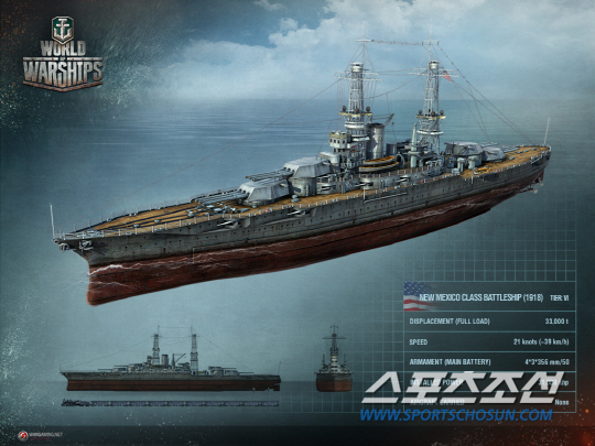 이를 통해 '월드 오브 워쉽'에 등장하게 될 미국 전함 '뉴멕시코(New Maxico)'의 신규 스크린샷이 공개됐다. 뉴멕시코 전함은 수십년간 미 해군을 이끌었으며 제 2차 세계대전 당시 강력한 힘을 발휘했던 미국의 장수 전투함이다.