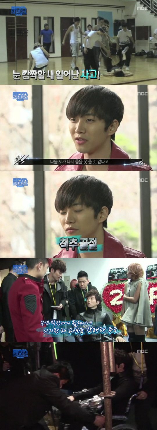 그러나 준호는 "다음 날 공연이었다. 어떻게 할 수가 없어서 무대에 올라가기 전까지 휠체어를 타고 있었다. 복대로 허리를 싸매고 서서 노래만 불러야 했다"고 당시 상황을 이야기 했다.