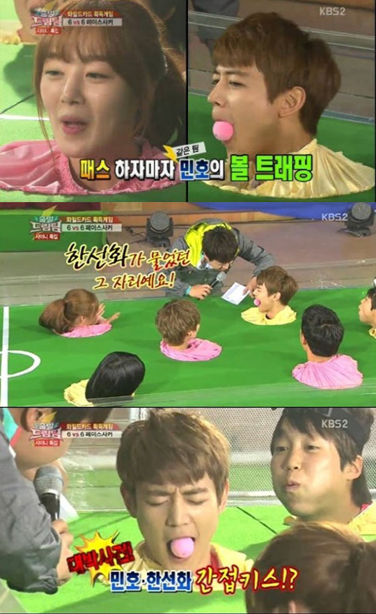 한선화가 볼을 트래핑한 후 민호에게 패스했고, 민호는 한서화가 입에 문 볼을 그대로 트래핑해 골로 연결했다. 이 과정에서 민호와 한선화는 한 공을 서로 입에 문 간접키스를 한 것. 이에 경기의 승패보다 간접 키스한 사실에 경기를 관람하던 여고생 팬들은 절망에 빠진 듯 비명을 질러 웃음을 자아냈다.