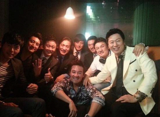 공개한 사진은 대한민국을 대표하는 톱스타 배우들이 한자리에 모여 있다. 김수로를 비롯해 배우 박중훈, 주진모, 장동건, 안성기, 공형진, 신현준, 현빈, 엄태웅까지 멋지게 차려입은 이들의 모습은 시상식의 애프터 파티 현장을 방불케 했다.