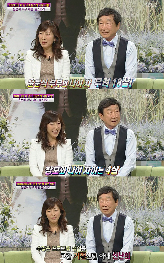 MC 조영구는 "윤문식 부부는 무려 18살 나이 차가 난다"라며 "그럼 장모님하고는 몇 살 차이가 나느냐"고 묻자 윤문식은 "장모님하고는 4살 차이가 난다. 나보다 4살 위다"라며 "누나처럼 나를 대해준다. 30년 동안 '마당놀이'를 관람해온 나의 열혈 편이다"고 말해 시청자들의 눈길을 끌었다. <스포츠조선닷컴>