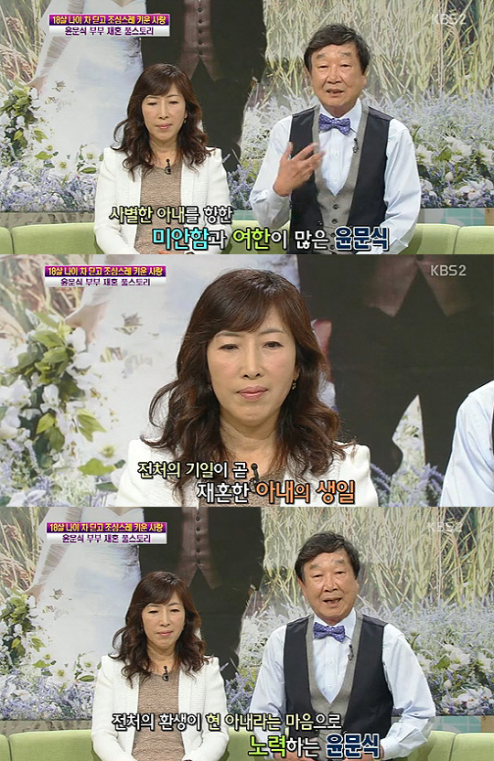 방송에서 윤문식은 "15년 동안 전처 병간호를 했다. 결국 전 부인과 사별한 후 허전함과 상실감이 컸다"며 "전처가 살아있을 때 '더 좋은 말을 할 걸, 짜증 덜 낼 걸' 그런 여한이 많다. 지금 아내에게는 미안하지만 아직도 가끔 생각난다"고 말했다.
