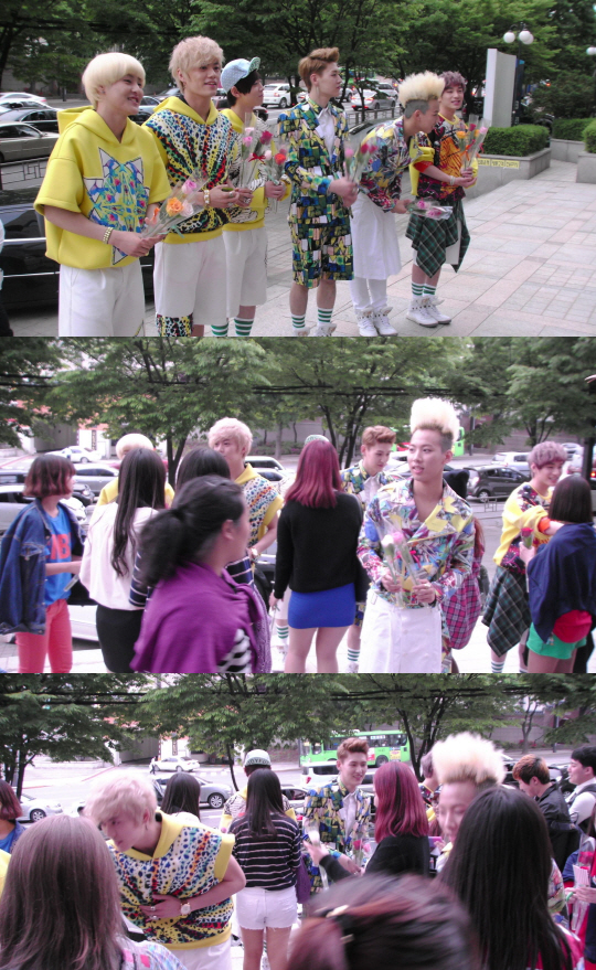 신인그룹 LC9 멤버들이 공개방송 녹화 현장에 온 팬들에게 장미꽃을 선물하는 사진이 올라와 화제다.