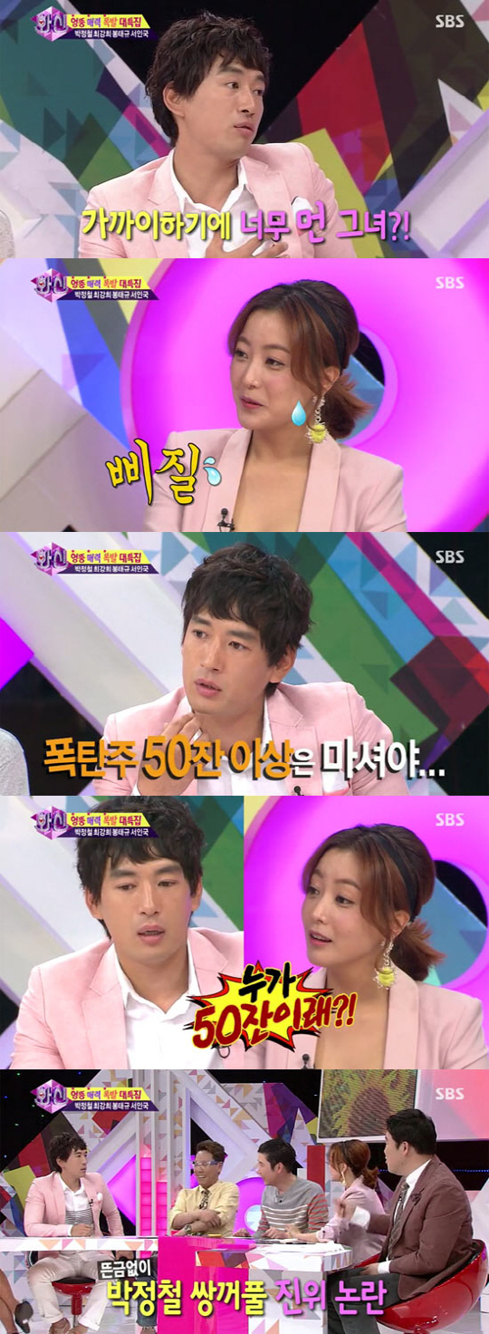 박정철의 '술'이야기에 당황한 김희선에게 그는 "20대 초반 학창시절에 소문으로 듣자하니 폭탄주가 50잔 이상 넘어야 희선이랑 술 한 잔 할 수 있다는 이야기를 들었다"고 폭로했다.