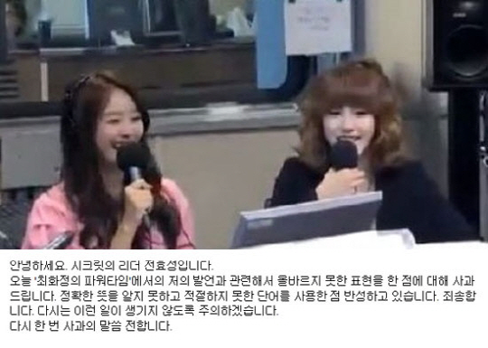 전효성은 14일 자신의 트위터에 "오늘 '최화정의 파워타임'에서의 저의 발언과 관련해 올바르지 못한 표현을 한 점에 대해 사과드립니다"라고 운을 뗐다. 이어 전효성은 정확한 뜻을 알지 못하고 적절하지 못한 단어를 사용한 점 반성하고 있습니다. 죄송합니다"라며 "다시는 이런 일이 생기지 않도록 주의하겠습니다"라고 거듭 사과의 뜻을 전했다.