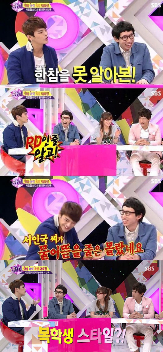 그러자 옆에 있던 서인국은 "봉태규가 PD님인 줄 알고 대기실에서 인사를 늦게 드렸다"며 "한 30분 같이 있었던 걸로 알고 있는데……. 근데 보니까 봉태규씨더라. 죄송하다며 인사했다"고 전했고, 봉태규는 "서인국씨가 저를 물어뜯을 줄 몰랐다"고 답해 스튜디오를 폭소케 했다.