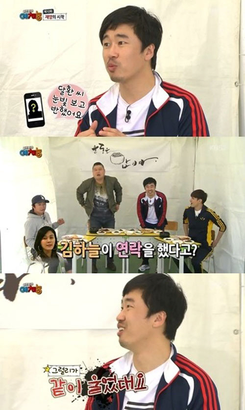 이에 이수근이 "김하늘씨 한 번 오라고 하라"고 말하자, 휴대폰을 꺼내든 강호동은 "전화번호를 모른다"라고 멋쩍게 답해 웃음을 자아냈다. <스포츠조선닷컴>