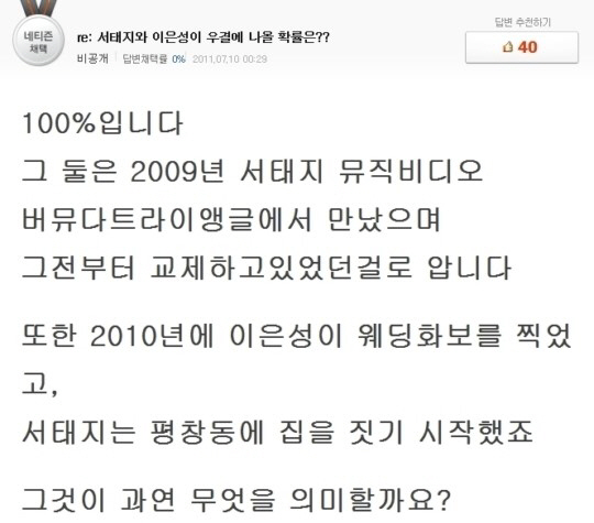 약 2년 전엔 2011년 7월 포털사이트 네이버 '지식인' 게시판에는 아이디 far****이라는 이름의 네티즌이 '서태지와 이은성이 우결에 나올 확율은?'이라는 제목의 글을 올렸다. 이 글 밑에는 '100%입니다. 그 둘은 2009년 서태지 뮤직비디오 버뮤다 트라이앵글에서 만났으며 그 전부터 교제하고 있었던 걸로 압니다. 또한 2010년에 이은성이 웨딩화보를 찍었고 서태지는 평창동에 집을 짓기 시작했죠. 그것이 과연 무엇을 의미할까요?'라는 내용의 의미심장한 답글이 달렸다.
