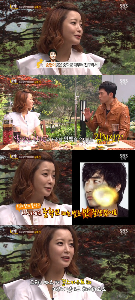 이에 리포터는 "잘생긴 사람들과는 꾸준히 인맥을 유지하는 것 같다"고 말했고, 김희선은 "아니다. 송승헌은 중학교 때는 별로 안 잘생겼다"고 돌직구를 날렸다.