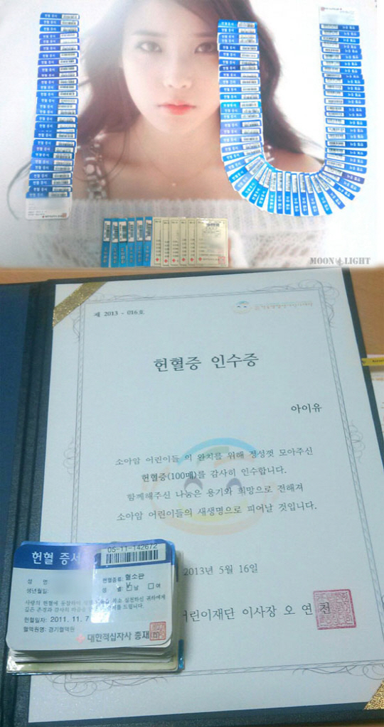 아이유의 생일(16일)을 맞아 소아암 환아 위해 헌혈증을 모아 기부하는 따뜻한 선행을 실천한 팬들은 아이유의 이름으로 받은 헌혈증 인수증까지 공개해 시선을 모은다. 헌혈증 인수증에는 '소아암 어린이들의 완치를 위해 정성껏 모아주신 헌혈증(100매)을 감사히 인수합니다. 함께해주신 나눔은 용기와 희망으로 전해져 소아암 어린이들의 새 생명으로 피어날 것입니다'라는 글귀가 적혀있어 훈훈함을 자아낸다.