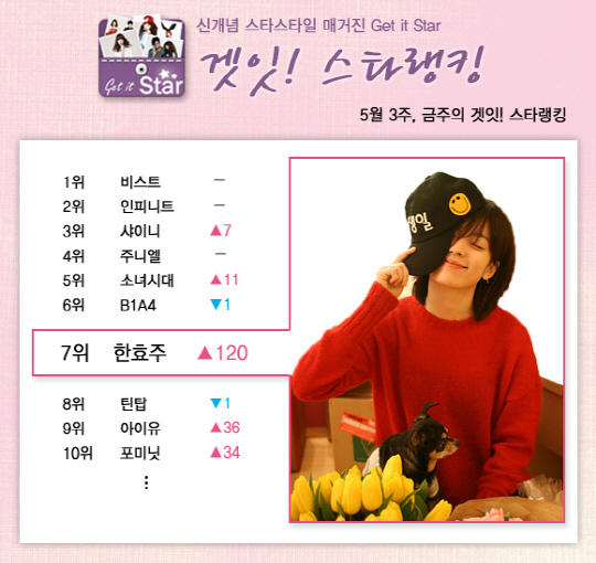 2013년 5월 3주차 겟잇스타랭킹에서 한 여배우의 이름이 눈길을 끕니다. 그 주인공은 바로 한효주! 개봉을 앞둔 영화 '감시자들'에서 설경구, 정우성과 함께 열연, 팬들을 기다리고 있습니다. 이 덕분일까요? 겟잇스타랭킹에서도 무려 120계단이나 상승해 단숨에 TOP 10에 진입했네요. '청순녀' 한효주가 감시자들에서는 어떤 색다른 모습을 보여줄지 벌써 기대를 모으고 있습니다.