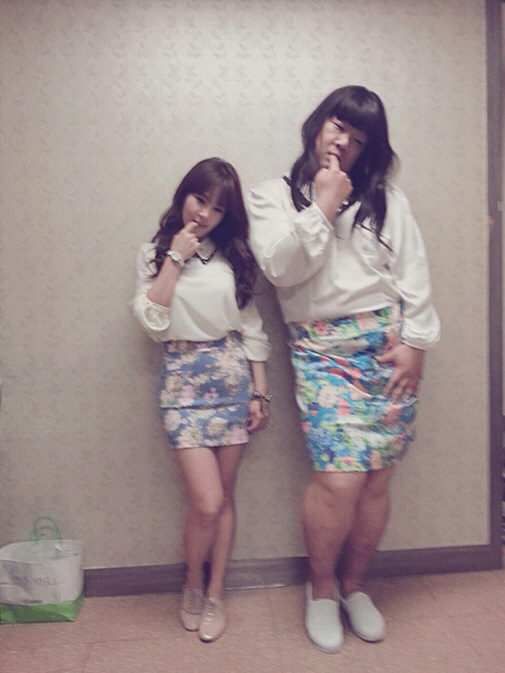 사진 속 김지민은 유민상과 똑같이 플라워 프린트된 초미니에 흰색 블라우스를 입고 손가락을 입에 대는 똑같은 포즈를 취해 보였다. 유민상은 여성 가발을 쓰고 다소곳한 포즈를 선보여 보는 이의 웃음을 유발했다.