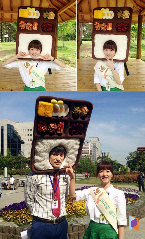 또 같은 도시락을 머리에 쓰고 있는 정유미는 자신의 몸집보다 큰 도시락이 어깨 전체를 감싸고 있어 눈길을 끌고 있다. 특히 뽀얗고 여신 외모를 뽐내고 있는 정유미는 손가락으로 턱을 바친 채 브이를 하거나, 귀요미 표정을 지어 보여 시선을 사로잡았다.