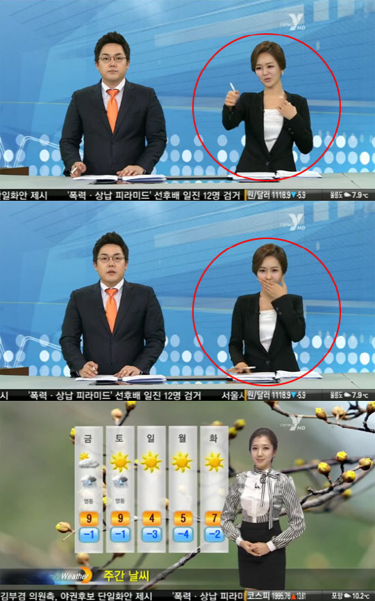 사고가 난 장면은 날씨 소개 뒤 다시 스튜디오로 넘어 오는 상황에서 일어났다. 이날 검정 줄무늬 셔츠에 리본으로 포인트를 준 의상을 입은 이여진 기상캐스터의 스타일이 재밌었던 김난영 아나운서는 카메라가 자신에게 넘어 온 줄 모르고 "어머 쟤(이여진 기상캐스터) 스튜어디스 같아"라며 농담섞인 말을 던졌고 손가락으로 가리키는 모습까지 전파를 탔다.