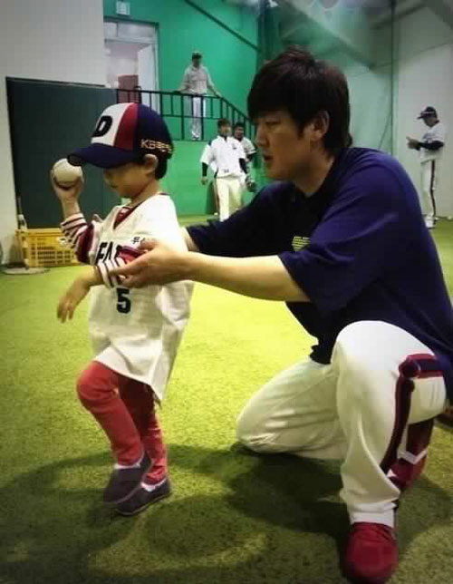 지난 5일 김성주와 김민국 군은 서울 잠실구장에서 열린 2013 두산 베어스와 LG트윈스와의 경기에서 어린이날을 맞아 시구자로 나섰다. 이에 이날 김민율 군 역시 시구 연습에 동참한 것.