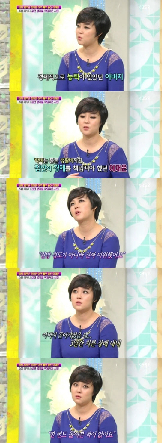 이날 이재은은 결혼 1년 뒤 뇌출혈로 2년간의 투병생활 끝에 돌아가신 아버지에 대한 이야기와 아역시절부터 집안 생계를 위해 돈을 벌어야 했던 사연을 고백했다.