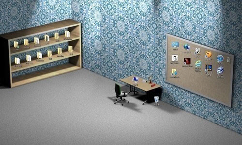 이 바탕화면은 책장, 책상 위 등에 여러 아이콘들이 가지런히 배치되어 있는 것이 특징이며, 특히 책상 아래에는 실제 휴지통처럼 사용되는 휴지통 아이콘이 있어 웃음을 자아낸다.