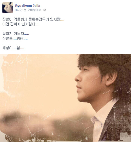 류시원은 22일 자신의 페이스북에 "진실이 억울하게 묻히는 경우가 있지만.... 이건 진짜 아닌 거 같다.... 끝까지 가보자..... 진실을.... 위해.... 세상이.... 참...."이라는 글로 현재 심정을 밝혔다.