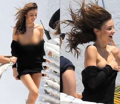 이날 속옷을 입지 않았던 미란다 커는 갑자기 불어온 바람에 옷이 흘러내렸고, 그녀 주위에 진치고 있던 파파라치의 카메라에 고스란히 무방비의 가슴이 포착됐다.