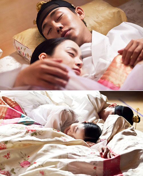 이 가운데 공개된 이순과 장옥정의 로맨틱하면서도 화기애애한 합방신 비하인드 컷은 뜨거운 반응을 얻고 있다. 공개된 사진은 김태희가 유아인 팔베개를 베고 자는 장면으로 두 사람이 마치 실제 자고 있는 듯한 리얼한 숙면연기를 선보이고 있어 눈길을 끈다.