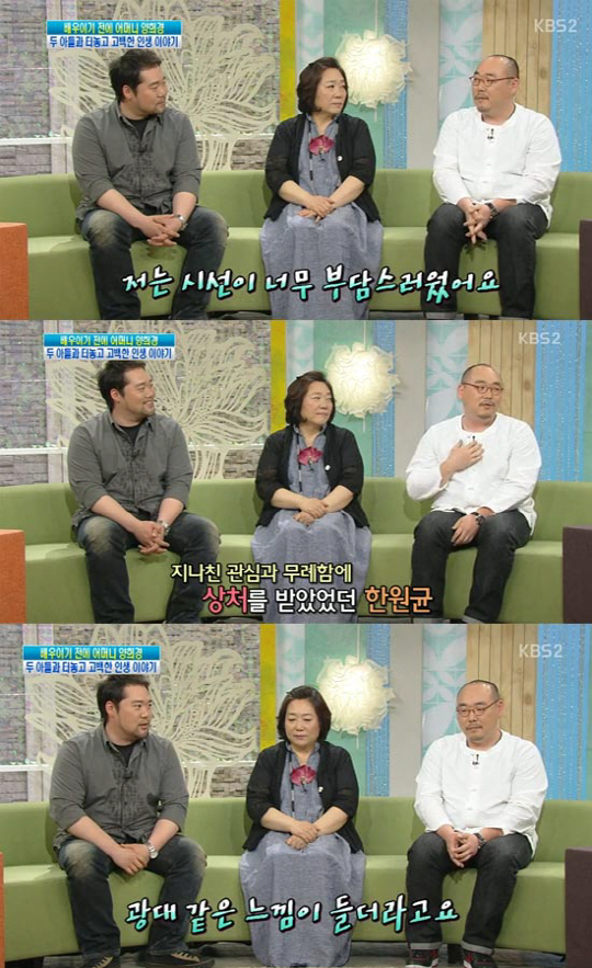 양희경은 23일 방송된 KBS 2TV '여유만만'에 두 아들 한원균, 한승현과 동반 출연해 두 아들과 인생사에 대해 터놓고 이야기 했다.
