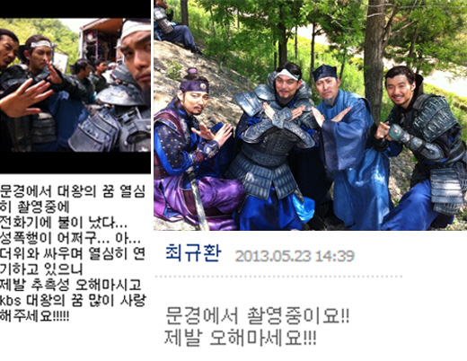 사진에는 최규환이 KBS 1TV 드라마 '대왕의 꿈'에 출연 중인 동료 배우들과 함께 극 중 의상을 입은 채로 손으로 X(엑스)자를 그리는 포즈를 취하며 오해하지 말라는 뜻을 전했다.