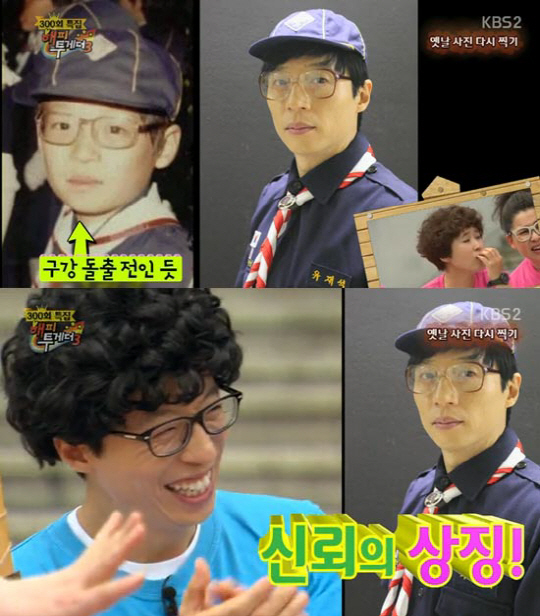 사진 본 송은이는 "어린 시절에는 치열이 가지런해서 입이 좀 튀어 나오기 전 이었다"며 "어린 시절 치과를 안 갔냐"고 놀려댔다. 이어 이영자는 "지금은 나이가 들어 보안 업체 직원 같다"고 말해 유재석을 폭소케 했다.