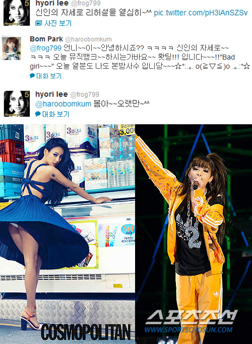 이에 박봄은 "언니 안녕하시죠? 신인의 자세로 오늘 '뮤직뱅크' 하시는가봐요. 파이팅입니다! 'Bad girl' 오늘 여러분도 나도 본방사수입니다"라며 귀여운 응원 메시지를 전했다.