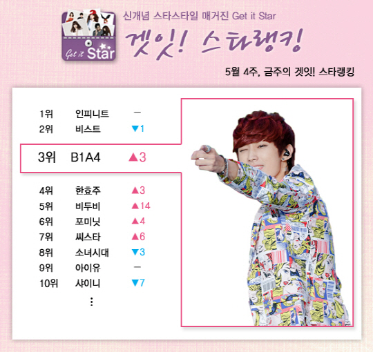 2013년 5월 4주차 겟잇스타랭킹에서 인피니트-비스트의 '양강 체제'를 위협할 팀이 등장했습니다. 새 앨범 '이게 무슨 일이야'로 돌아온 아이돌 그룹 B1A4가 바로 그 주인공. 특히 최근 음반판매량에서 신화, 2PM, 이효리, 샤이니 등 쟁쟁한 선배들을 제치고 1위에 오르는 기염을 토하며 인기를 더하고 있습니다. 그뿐 아니라 '우결(우리 결혼했어요) 세계판' OST도 참여하며 승승장구 중. 이들의 활약, 기대할 수밖에 없겠죠?