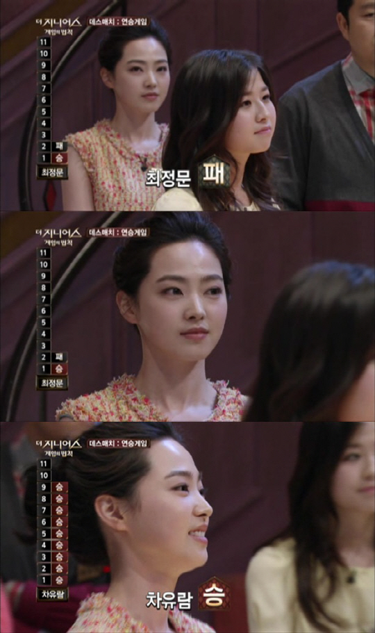 차유람의 데스 매치 상대는 서울대 공대 여신이자, 멘사 출신 최정문. 최정문은 지난 주 엄친아 연기자 최창엽을 꺾는 등 여타 출연자에 비해 지략 면에서 압도적인 모습을 보여왔던 출연자이다. 하지만 최정문의 지략도 사람을 잃지 않아야 생존 할 수 있는 '더 지니어스'의 가장 중요한 명제 앞에서는 힘을 잃었다.