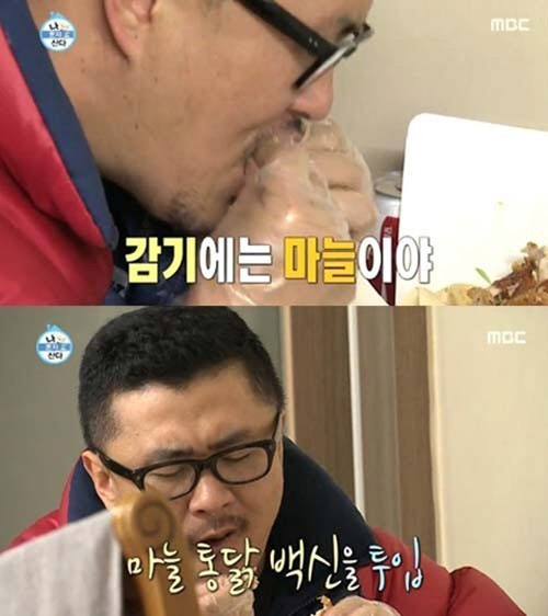 수술을 준비하는 의사처럼 경건하게 비닐장갑을 끼고 마늘통닭을 맛본 데프콘은 감기에 걸렸음에도 '폭풍 먹방'을 선보여 시청자들의 식욕을 자극했다. 특히 그는 콧물을 훌쩍이며 '맛있다'는 감탄사를 연발해 웃음을 자아냈다.