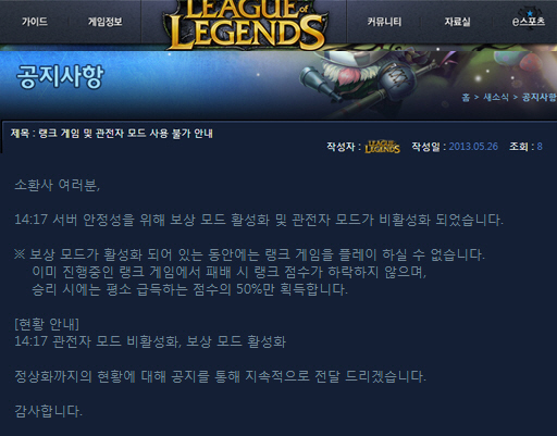 서버 폭주로 접속이 원활하지 않던 온라인 게임 '리그 오브 레전드(이하 롤)'이 다시 관전자 모드 비활성화를 공지하며 이용자의 불만을 유발하고 있다.
