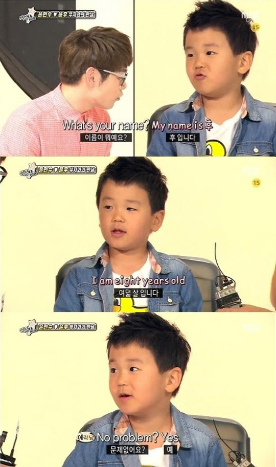 이에 에릭남은 윤후에게 '이름이 뭐냐', '몇 살이냐', '취미가 뭐에요'라는 질문을 던졌고, 윤후는 거침없이 완벽하게 대답해 주위를 놀라게 했다.