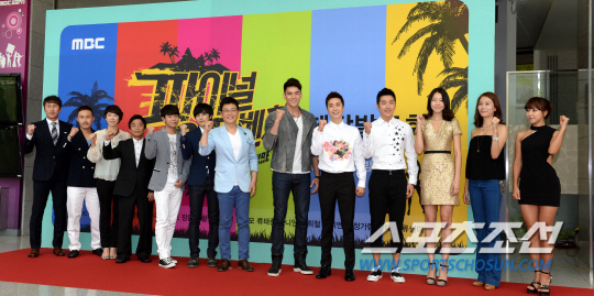 MBC 새 예능 '파이널 어드벤쳐'의 제작발표회가 15일 일산 MBC 드림센터에서 열렸다. 유상철, 김주경, 장윤경, 심권호, 토니안, 정희철, MC 김성주, 줄리엔강, 조성모, 류태준, 한혜진, 황인영, 이본(왼쪽부터)이 포즈를 취하고 있다.