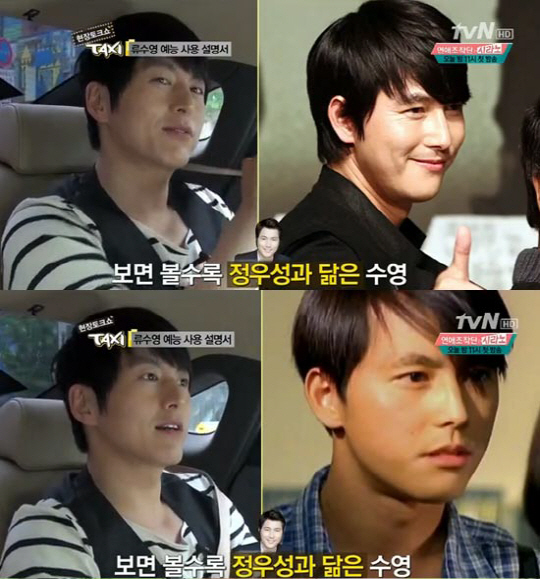 이날 MC전현무는 "류수영이 SBS '진실게임'에 살찐 정우성으로 출연한 적 있다"며 정우성 닮은꼴로 출연했던 사실을 언급했다. 이에 류수영은 "정우성씨는 제가 진짜 좋아하던 분이다. 학생 때 그분 영화를 많이 봤다"며 "저는 그렇게 잘 생긴 분과 닮았다니 기분 좋다"며 소감을 전했다.