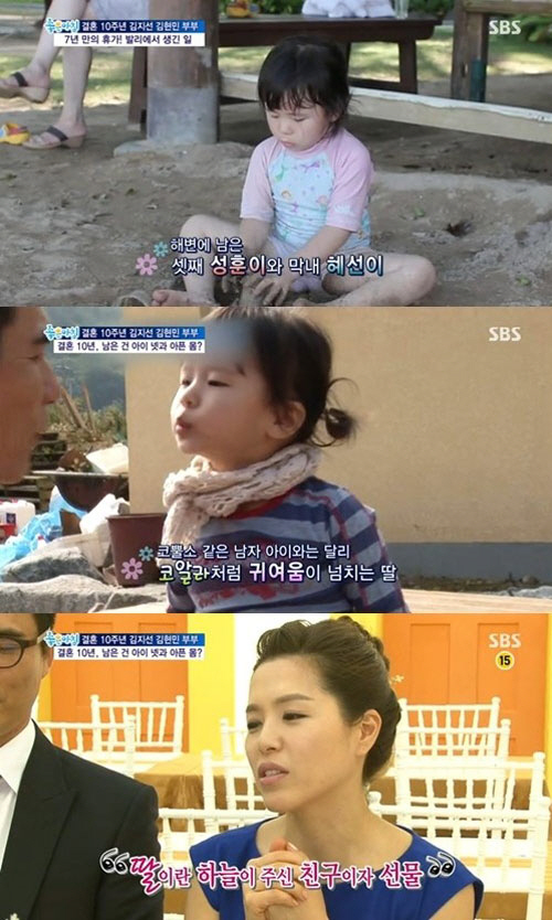 이어 방송을 통해 공개된 김혜선 양은 엄마를 닮은 예쁘장한 외모와 엄마에 매달리는 등 애교 있는 모습으로 시청자들의 시선을 사로잡았다.