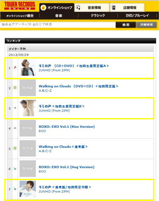 준호는 직접 프로듀싱한 솔로 앨범 '키미노 코에(너의 목소리)'로 29일자 타워레코드 예약 차트 1, 3, 7위를 차지했다. '키미노 코에'는 28일자 예약 차트에서 2위를 차지한 바 있다. 그러나 1위에 올랐던 2PM '기브 미 러브'가 발매되면서 해당 차트에서 제외되자 바로 1위로 올라섰으며, 3가지 버전 앨범을 모두 10위권 안에 안착시키면서 그 인기를 입증했다.