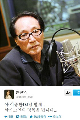 안선영은 30일 자신의 트위터에 "아 이종환DJ님 별세. 삼가 고인의 명복을 빕니다"라며 애도를 표했다.