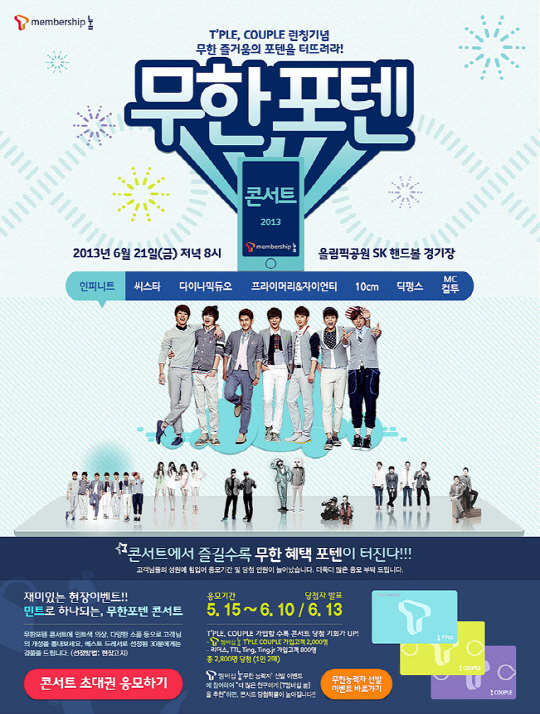 SK텔레콤(대표이사 사장 하성민, www.sktelecom.com)은 T멤버십 '슌 출시 기념으로 댄스, 힙합, 락, 인디음악 등 장르 제한 없이 즐길 수 있는 '무한포텐 콘서트'를 기획했다. MC 컬투의 진행으로 아이돌, 힙합뮤지션, 인디밴드의 무대가 각각 다른 스테이지로 구성돼 기대를 모으고 있다.